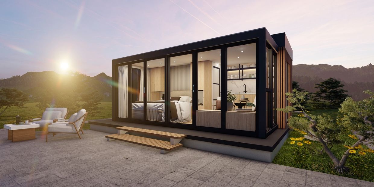 Upgrade your lifestyle with this expandable container home. The Pelican features LVP flooring throughout, custom bedroom cabinetry, and a sleek under-counter panel-front fridge that blends seamlessly into the kitchen cabinets. Quartz countertops and matching backsplash add a modern touch, while ceiling-mounted shelves maximize space. The spacious bathroom with a walk-in shower ensures comfort. Perfect for modern modular living, this home combines style, functionality, and move-in ready convenience